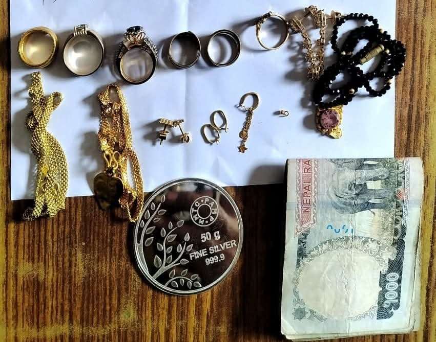 उनीहरूको साथबाट चाँदीको सिक्का (५० ग्राम) – १ थान, हिरा जस्तो देखिने पत्थरयुक्त औंठी – २ थान, सुन जस्तो देखिने बेरुवा औंठी – १ थान, सुन जस्तो देखिने सिक्री – १ थान, पानको पात आकारको सुन जस्तो देखिने सिक्री – १ थान, हिरा जस्तो देखिने झुम्का – १ जोर, सुन जस्तो देखिने औंठी – १ थान, खुट्टामा लगाउने सुन जस्तो देखिने बिछिया – २ थान, नागिनी माला – १ थान, कानमा लगाउने सुन जस्तो देखिने रिङ – १ जोर र सुन जस्तो देखिने गहना र नगद १३,००० रुपैयाँ बरामद गरिएको छ।त्यसैगरी, घटनास्थलबाट लु.प्र. ०१-००३ प २२९९ नम्बरको यामाहा मोटरसाइकलसमेत बरामद गरिएको छ। पक्राउ परेका व्यक्तिहरूलाई इलाका प्रहरी कार्यालय टिकापुरमा राखी थप अनुसन्धान भइरहेको प्रहरीले जनाएको छ।