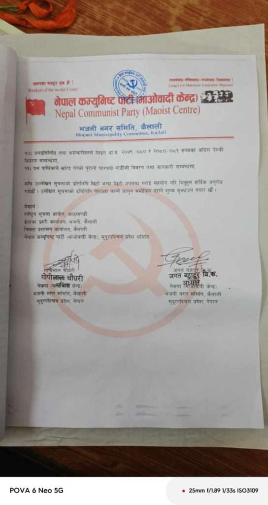 कैलालीको भजनीमा नेकपा माओवादी केन्द्र भजनी नगर कमिटीले भजनी नगरपालिकासँग सुचना माग गरेको छ ।