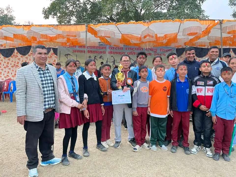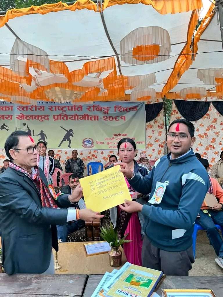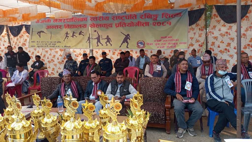 एक कार्यक्रमका बिच राष्ट्रपति रनिङ शिल्ड प्रतियोगिता सम्पन्न भएको आयोजकले जानकारी दिएको हो। नगरपालिकाको शिक्षा, युवा तथा खेलकुद शाखाको आयोजनामा २२ माघ मंगलबार भजनी नगरपालिका-१ महुन्याल माविको प्राङ्गणमा सुरु भएको थियो।माघ २२ देखि२८ गते सम्म संचालन हुने प्रतियोगितामा भजनी नगरपालिका क्षेत्रमा रहेका ५४ वटा विद्यालयका भाइबहिनी खेलाडीहरूले विभिन्न खेलमा प्रतिस्पर्धा गरिरहेको कार्यक्रम संयोजक शिक्षा शाखा अधिकृत पंख बहादुर शाहले जानकारी दिए।खेलाडीहरुलाई पुरस्कार वितरण गर्दै नगर प्रमुख केवल चौधरीले भजनीमा खेल निरन्तर अगाडि बढाउने बताए । चौधरीले पालिकाको खेलकुद क्षेत्रको विकासमा आफ्नो सदैव साथ र सहयोग रहने बताउँदै भोलिका दिनमा भजनीमा खेल क्षेत्रको उल्लेख्य विकास हुने र यहाँबाट राष्ट्रिय स्तरका खेलाडी तयार हुनेमा आफू प्रतिबद्ध रहने बताउनुभयो। साथै प्रतियोगिताको समापन गर्दै चौधरीलेले खेलकुद क्षेत्रको विकास र खेलाडीको क्षमता बढाउन पालिकाले स्रोत र साधन जुटाउन सक्दो सहयोग गर्ने र जित हासिल गर्ने विद्यालय र विद्यार्थीलाई बधाई तथा शुभकामना दिँदै खेलमा कसैको हार नभई जित हो अर्को आउने वर्ष जितेर देखाउन हौसला प्रदान गरिने बताउनु भयो।
