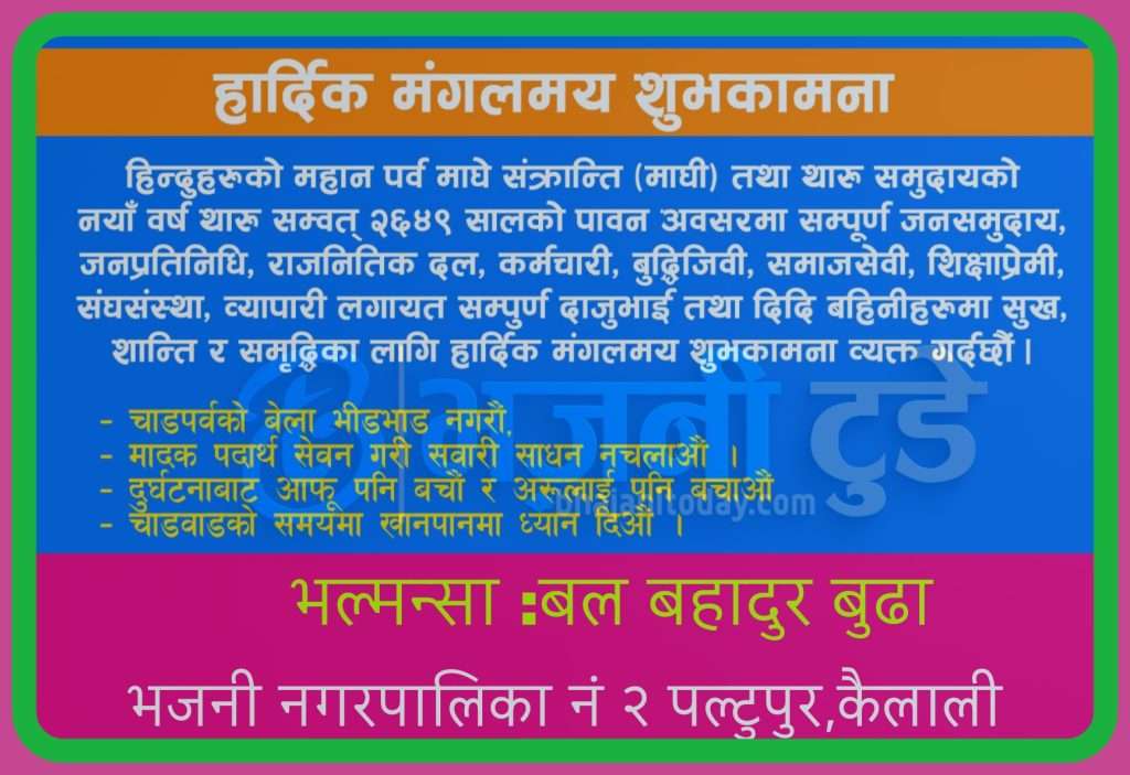 माघ २४ /भजनी नगरपालिका वडा नं. २ अन्तर्गत पर्ने पल्टुपुर गाउँमा सम्पन्न भल्मन्सा निर्वाचनमा बल बहादुर बुढा पुन पाँचौँ पटक भल्मन्सा पदमा विजयी भएका छन्। स्थानीय बासिन्दाहरूको व्यापक समर्थनसहित उहाँ पुनः नेतृत्वमा चयन हुनुभएको हो।