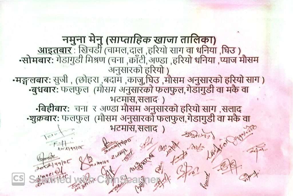 नगरपालिकाभित्रका ३० वटा सामुदायिक विद्यालयका प्रतिनिधिको सहभागितामा सम्पन्न कार्यक्रममा विद्यालयका पोषण फोकल शिक्षकलाई शिक्षा शाखा प्रमुख पंकबहादुर शाह र स्वास्थ्य शाखा प्रमुख कैलाश डर्गौराले सहजीकरण गर्नुभएको थियो।कार्यक्रममा बोल्दै प्रमुख प्रशासकीय अधिकृत भोजराज भट्टले नेपाल सरकारको मापदण्डअनुसार पोषणयुक्त मिश्रित खाजा प्रत्येक विद्यार्थीले पाउने सुनिश्चितताका लागि खाजा सूची निर्माण गरिएको बताउनुभयो। कम्तीमा प्रतिविद्यार्थी २० रुपैयाँ बराबरको पोषणयुक्त खाजा उपलब्ध गराउने उद्देश्यका साथ साप्ताहिक मेनु तयार गरिएको बताउनुभयो।