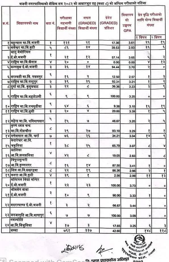 भजनी २७ चैत /भजनी नगरपालिकाको कक्षा ८ को नतिजा खस्किएको छ ।शैक्षिकसत्र २०८१ मा केही सुधार देखिएको नगरपालिकाको कक्षा ८ को वार्षिक परिक्षाको नतिजा यसपटक पुनः खस्किएको हो । नगरपालिकामा गतवर्ष परिक्षामा सहभागी भएका कुल बिद्यार्थीको ५६ प्रतिशत बिद्यार्थी उतिर्ण भएका थिए । यसवर्ष त्यो प्रतिशत घटेर ४२ मा झरेको छ । शैक्षिकसत्र २०८० मा भने २४ प्रतिशत विद्यार्थी मात्रै उतिर्ण भएको शिक्षा अधिकृत पंख बहादुर शाहले जानकारी दिएका छन् ।