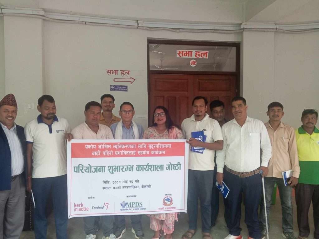 भजनी /कैलालीको भजनीमा बहुउद्धेश्यीय विकास समाज(MPDS),डडेल्धुराको आयोजनामा प्रकोप जोखिम न्यूनिकरणका लागि सुदूरपश्चिममा बाढी पहिरो प्रभावितलाई सहयोग कार्यक्रमको परियोजना शुभारम्भ कार्यशाला गोष्ठी भजनी नगरपालिकामा सम्पन्न भएको छ ।